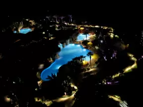 Gorgeous pool areas with splash pad and water cannons, lit up beautifully at night.