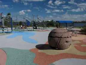 A huge wonderful park with a new playground that is out of this world, a lake with paddle boats, and plenty of trees and grass.