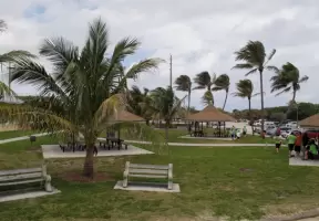 Large lagoon with clear water where kids can swim, tons of shade, and playground in the sand.