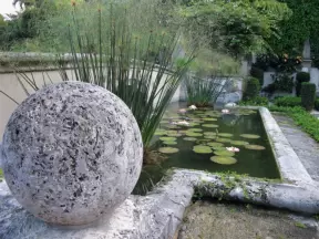 Pleasant garden with waterfall, huge lizards, boulders, pavilions with lovely circle windows and distinctive roofs, and pond, but some city noise.