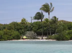 Paradise! A rare white sand beach in the Keys, with water of many shades of blue, and an ultra-modern playground amongst coconut trees with shaded huts.