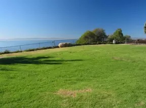 A huge green lawn looking out over the bright blue ocean and Leadbetter Beach.