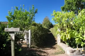 Wide partially shady path that leads through oak forest, past a market, and a Secret Garden with live music, to Avila Beach.