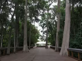 Gorgeous wetland area with wooden pier and promenade with blue benches. Steps from cute cafes and coffee shops of downtown Clermont.