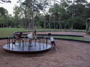 Super fun playground with merry-go-round and tons of climbing structures, all under the shade of tall trees.