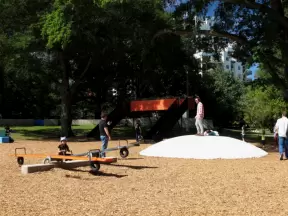 Best playground you'll ever visit! Huge slides, hillside slides, steep grass slope for cardboard sledding, cable zipline, and pretty trees to picnic under.