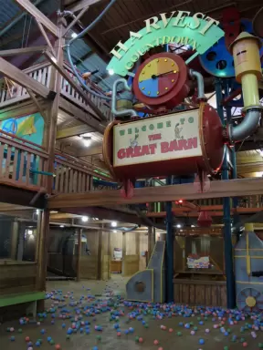 Attractive children's museum with market and carts, Newton's playhouse where you can shoot balls, ball pit, fire engine, oak tree tunnels, stage, dress-up area, and pizza kitchen.