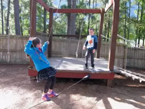 Super fun playground with merry-go-round and tons of climbing structures, all under the shade of tall trees.