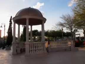 Adorable square with basilica, bandstand, cute shops, cafes with adobe walls and flowers.