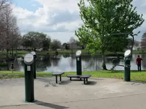 Large field with sweeping views, playgrounds, workout stations, picnic pavilions, and walking path around the field.