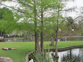 Whitest white sand, clear sparkling water, spacious green lawns with large shade trees, tropical flowers, a wide half-mile boardwalk, and a huge park full of tropical plants.