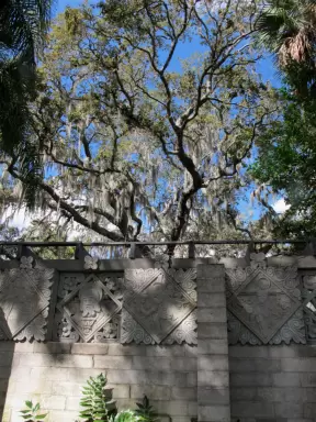 Short walk around shimmering lake with moss-draped trees, past Spanish mansions.