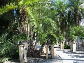 A tropical wonderland of palms, ferns, bromeliads, fountains, sculptures, rocks, ironwork gates, and pergolas, with the delightful scent of flowers filling the air.