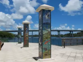 A happening spot with a sunken amphitheater by the water where kids can run in a splash pad and fountains are lit up at night. BurgerFi, Subculture Coffee, and a few restaurants.
