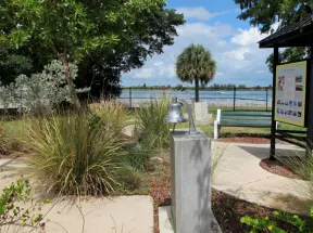 Pretty park along the intracoastal waterway near high rises, with walking paths, playground, gazebos, fountain, and tennis courts.