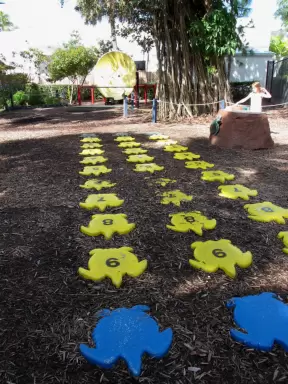 Park with plenty of benches in the shade, accessible playground with unusual equipment, tire swing, dome climby, wooden truck, dinosaur and dolphin bouncy, and plenty of swings.