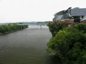 Tall waterfall at the mouth of the Montmorency River. You can walk stairs up to a suspension bridge over the falls.