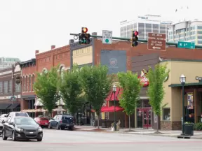 A main street of late 19th century storefronts, popular cafes, and a hip college scene. Recently, suffering an epidemic of homelessness relating to mental health problems.