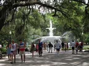 Short walk around shimmering lake with moss-draped trees, past Spanish mansions.
