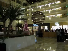 Indoor mall with sun canopies, decorative towers, fountains, and atriums.