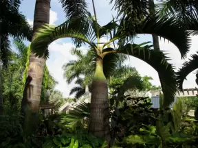 Lush paradise with water lilies galore, rustling bamboo, stone bridge, tropical flowers, strangler fig, and a gorgeous royal palm grove.