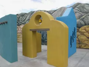 Adorable square with basilica, bandstand, cute shops, cafes with adobe walls and flowers.