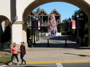 A colorful, spacious outdoor mall with boba tea, a toy store, and lots of teen clothing stores!