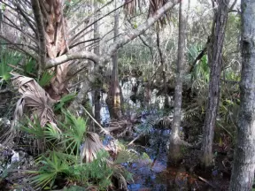 Tropical paradise with amazing trees, soft green grass, and woven huts shading picnic tables with BBQs that line the river, plus bike and kayak rentals. Beware alligators.