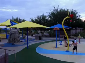 An attractive housing development with a super-fun huge community playground, a splash pad for summer days, and a waterslide park!