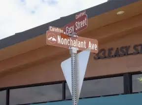 Main strip of West Palm Beach, with colorful and inviting architecture and decorations.