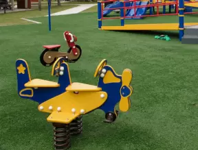 Incredible playground with so much play equipment! Jogging path, ducks on pond, huge skate park, and modern cafe as well.