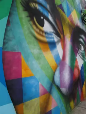A trendy street in the middle of a sketchy neighborhood, with cafes and colorful graffiti-covered walls.