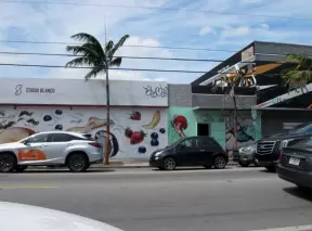Main strip of West Palm Beach, with colorful and inviting architecture and decorations.