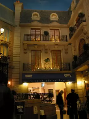 The Eiffel Tower, the Arc de Triomphe, and indoor cobblestone streets that look like Parisian streets, with Art-Nouveau Metro signs.