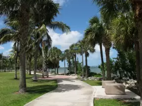 Waterfront park with walking paths under a zillion coconut trees, ship playground in white sand, hopscotch, and colorful pictures and hopscotch on the path.