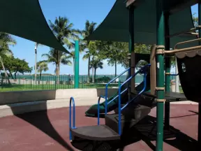 Tropical park with sky-high playground for older kids, toddler playground, fitness trail and stations, pale-lime gazebo, and spiffy basketball courts.