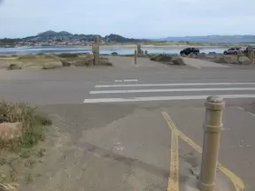 Flat wooden boardwalk loop trail along the estuary- you see divebombing pelicans, Morro Rock, cypress trees on the hills opposite, salt marsh, and mountains in the distance.