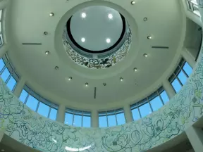 Beautiful, modern cathedral with colorful statues, the twelve stations of the cross, bright stained glass, light-filled rotunda, and amazing organ.