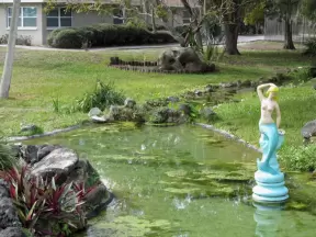 A tropical wonderland of palms, ferns, bromeliads, fountains, sculptures, rocks, ironwork gates, and pergolas, with the delightful scent of flowers filling the air.