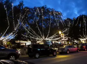 Romantic Christmas lights! Long strands of lights hanging elegantly from tall, regal trees in City Park, plus Vine Street Victorian houses.