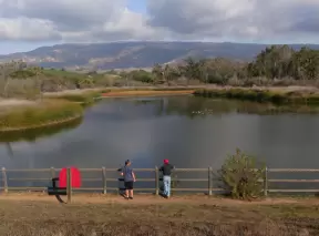 Open space with trail through long dry grasses and views of the hills, beside a blue lake with geese, picnic tables, and a playground.
