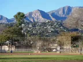Walking paths, plus pretty park with picnic spot on hill under trees, popular pickleball courts, playground, mountain views, field for dogs, tennis courts, and basketball court.