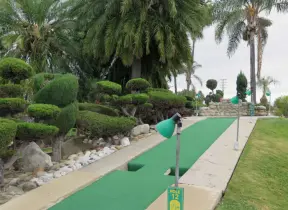 Mini-golf park with lush, colorful grounds, plus arcade games, mini-carousel, and rides.