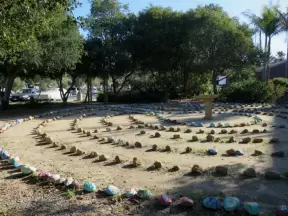 Wide partially shady path that leads through oak forest, past a market, and a Secret Garden with live music, to Avila Beach.
