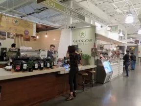 Health food store with great bakery, indoor seating with big windows, and outdoor picnic tables under thick leafy shade.