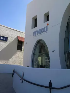 Upscale, colorful plaza in farmhouse style, with modern cafes. Kids climb on a huge log. The fire pit is fantastic at night, surrounded by eucalyptus trees.