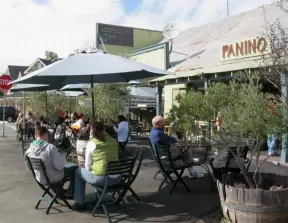 Upscale, colorful plaza in farmhouse style, with modern cafes. Kids climb on a huge log. The fire pit is fantastic at night, surrounded by eucalyptus trees.