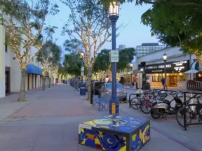 A main street of late 19th century storefronts, popular cafes, and a hip college scene. Recently, suffering an epidemic of homelessness relating to mental health problems.