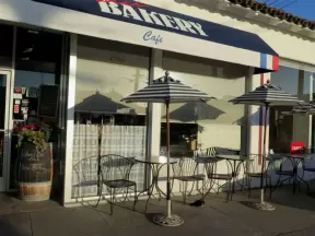 Italian restaurant with delicious gelato, independent bookstore, and excellent French bakery, plus castle tower and view of the mountains.