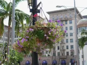 A sophisticated European-style development with shops, cafes, fountains, gorgeous architecture, and the most amazing flower baskets!